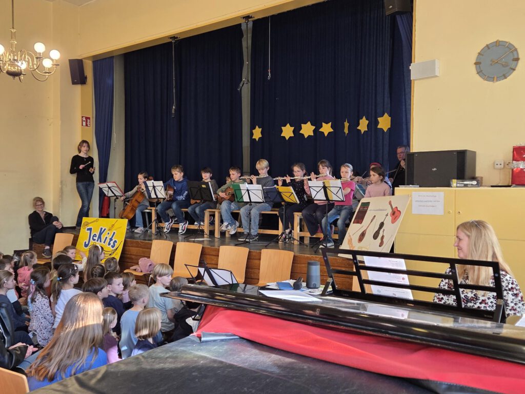 In Zusammenarbeit mit der Jugendkunstschule können Kinder an der Katharinenschule im Rahmen von JeKits und JeKits-plus verschiedene Instrumente lernen, singen und im Ensemble spielen.