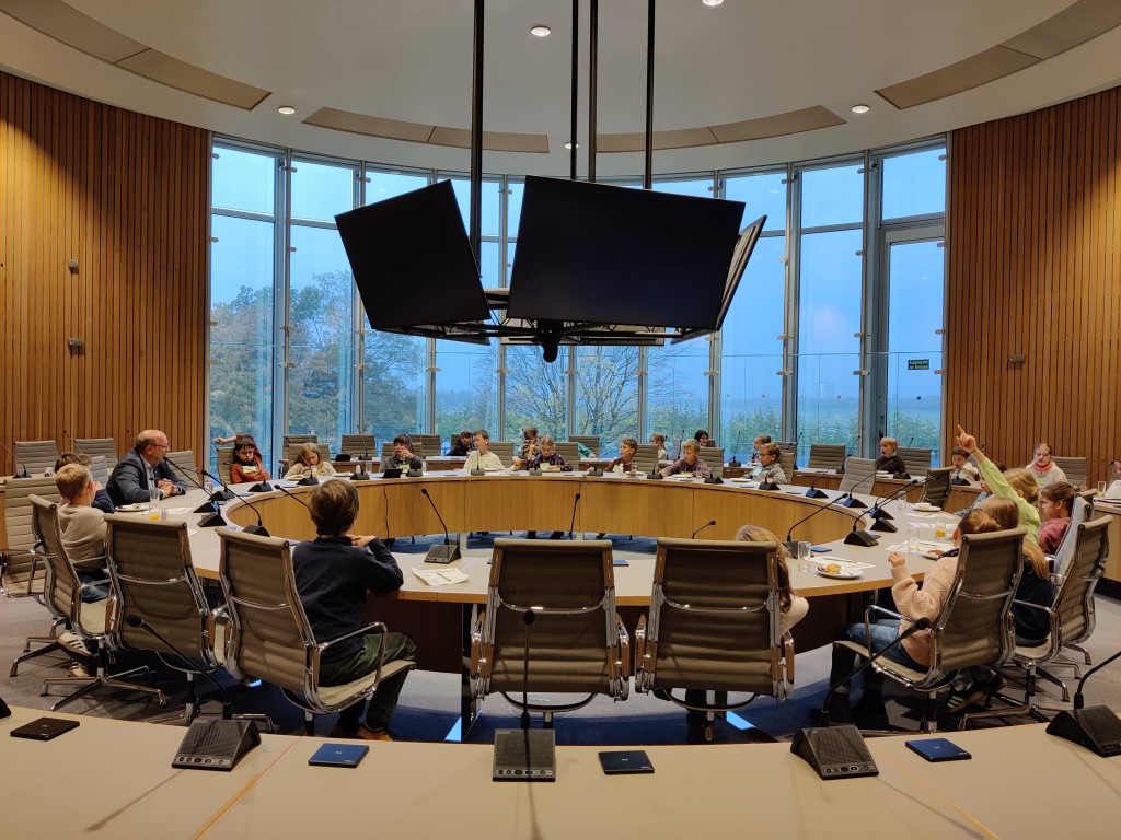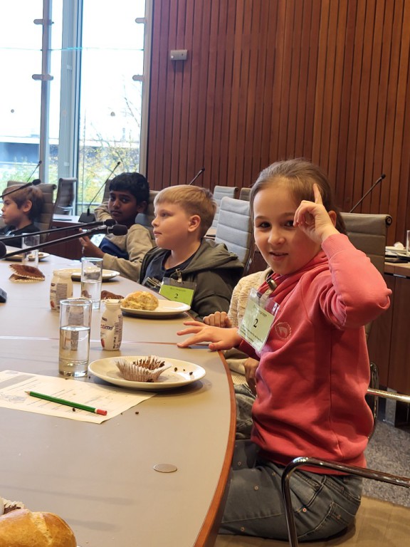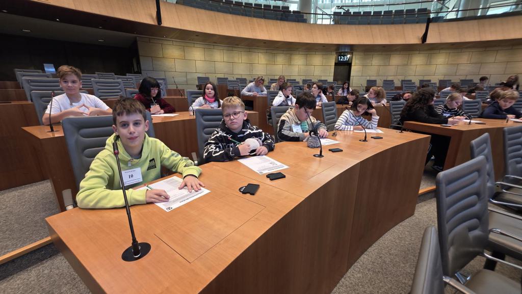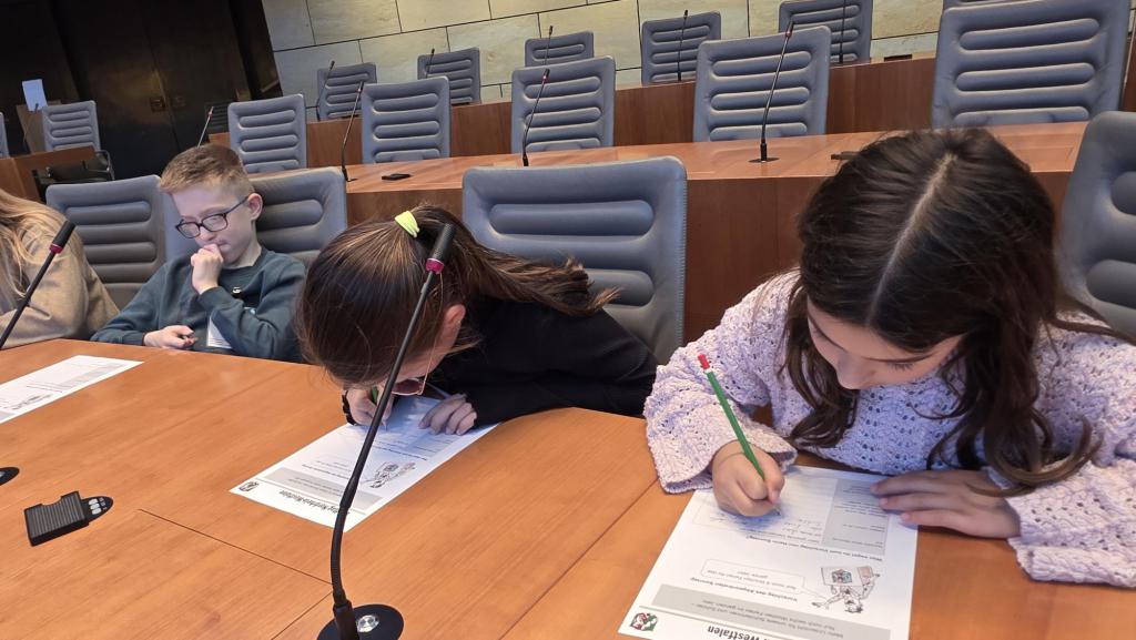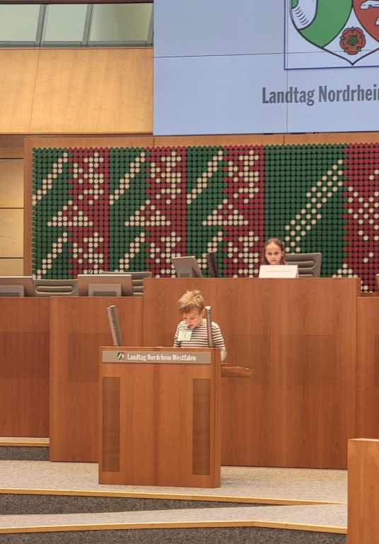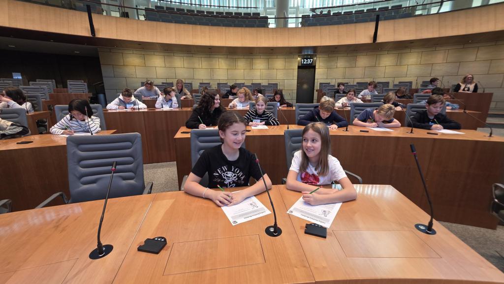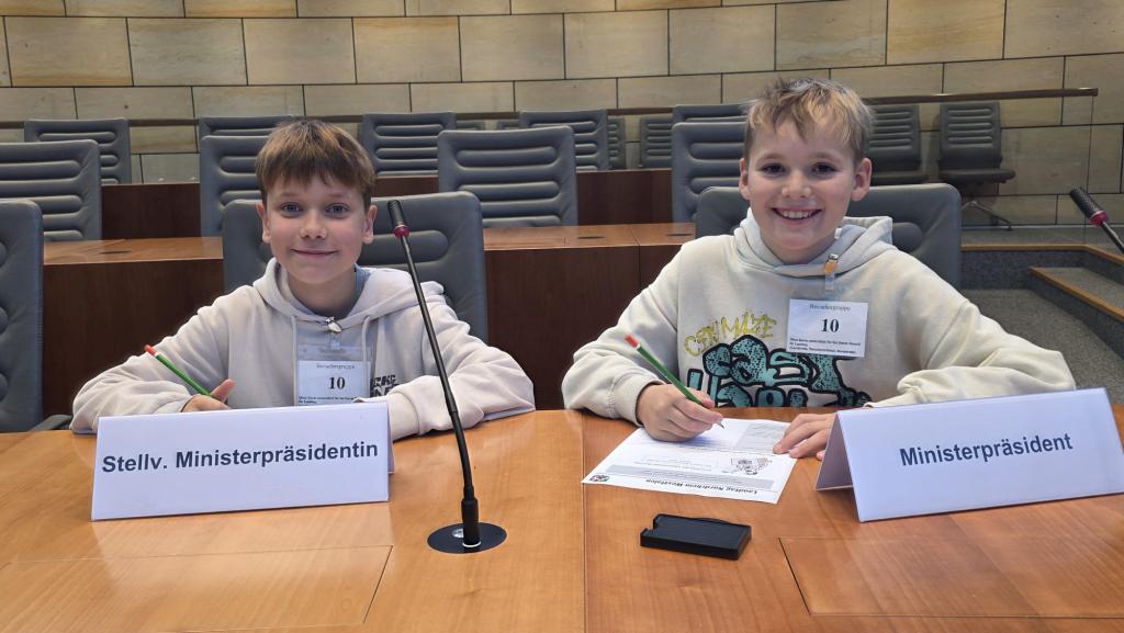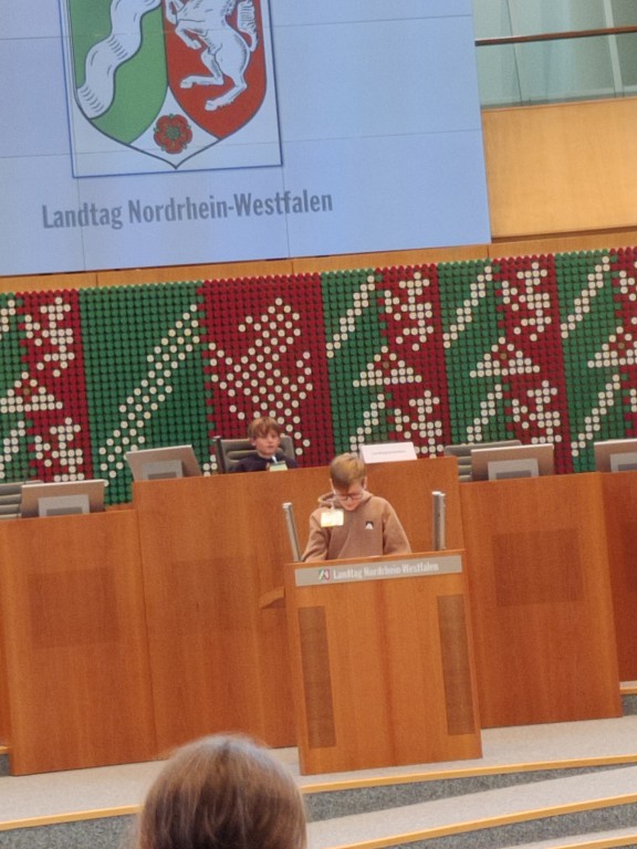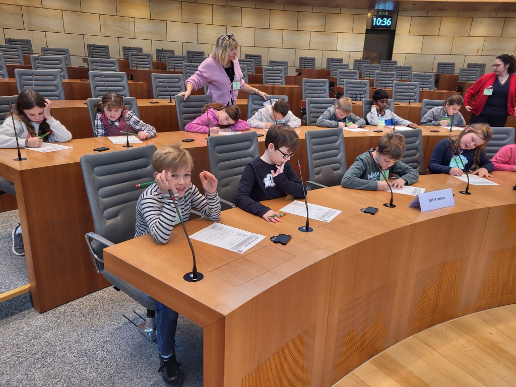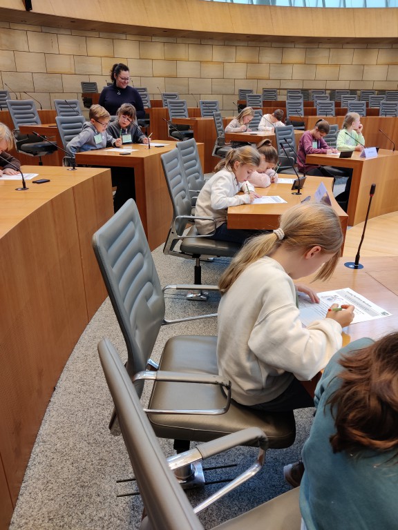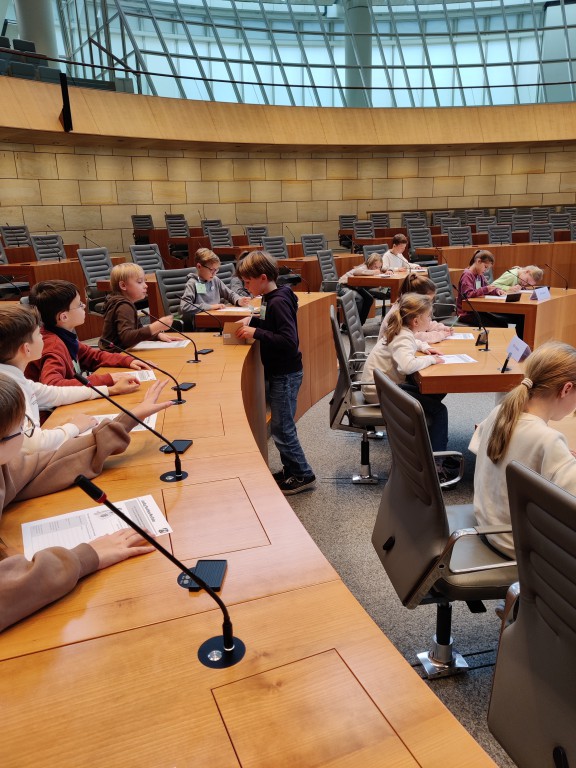 Nach einer halben Stunde gingen wir nach oben in den Plenarsaal und durften auf den Plätzen der Abgeordneten sitzen. Die Stühle waren sehr bequem. Ein Mann erklärte uns, was man im Landtag macht. Es wurden aus den verschiedenen Klassen Kinder ausgesucht, die die verschiedenen Rollen im Landtag (z.B. Ministerpräsident, stellvertretender Ministerpräsident, Präsident/in, und andere) und gab uns ein Blatt auf dem Herr Sonntag sprach: „Ab jetzt gibt es nur noch 6 Wochen Ferien im ganzen Jahr!“ Dazu gab er uns die Aufgabe, Meinungen und Argumente zu finden. Wir und die zwei anderen Klassen haben das alles ohne Probleme gelöst. Es ergab sich aus den Vorträgen am Rednerpult eine Diskussion. Es musste sogar die Präsidentin mit der Glock für Ruhe sorgen.
