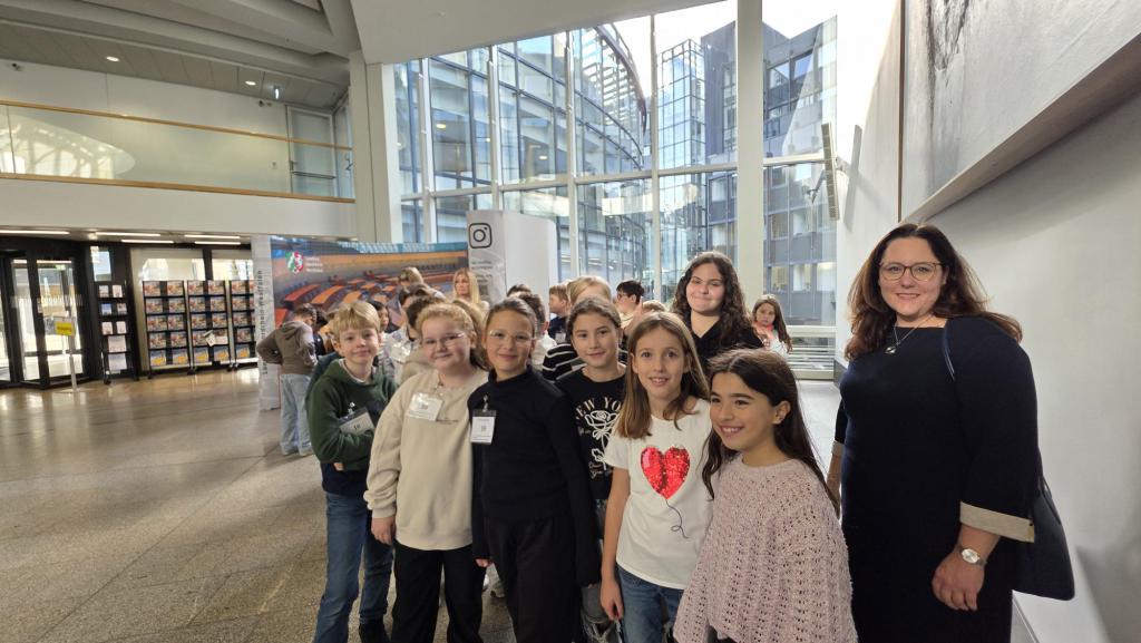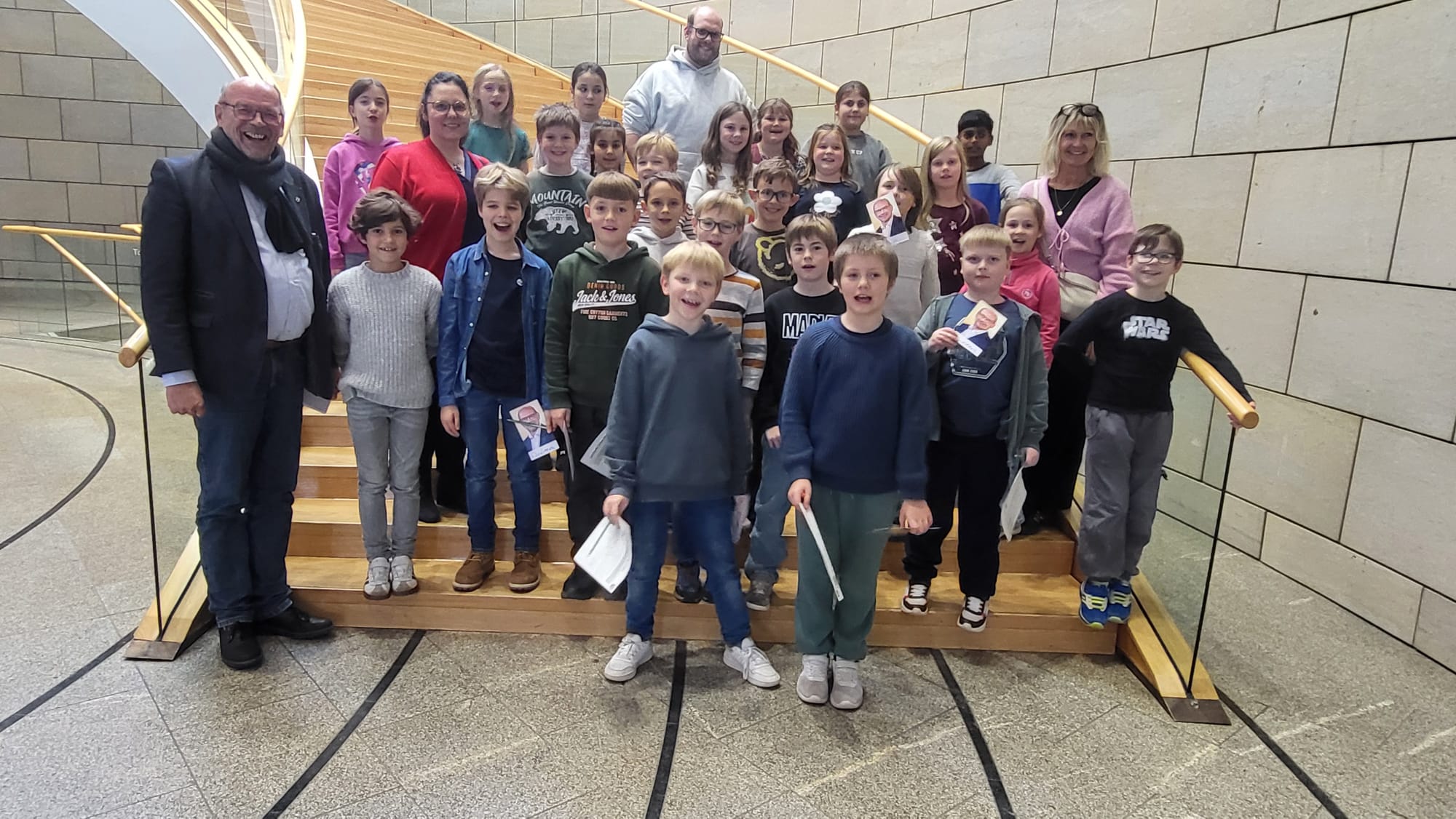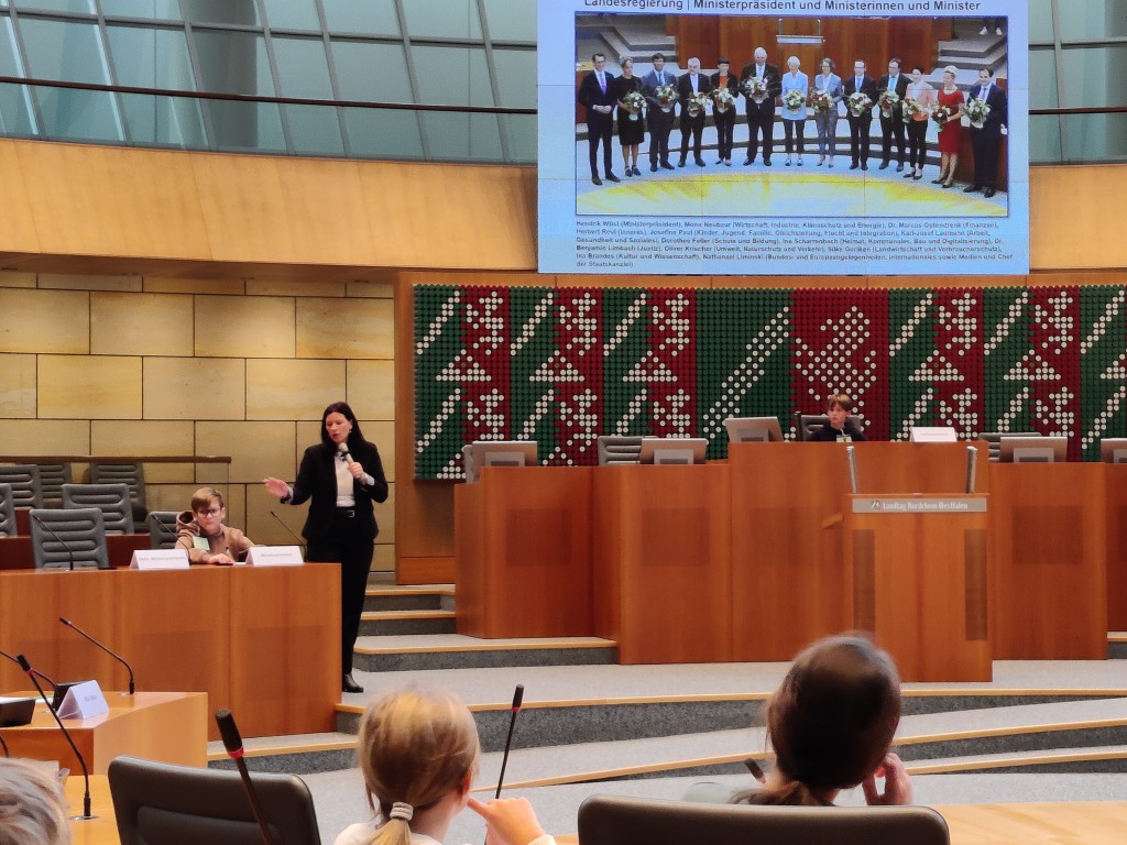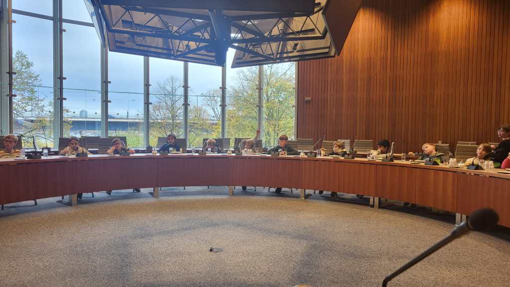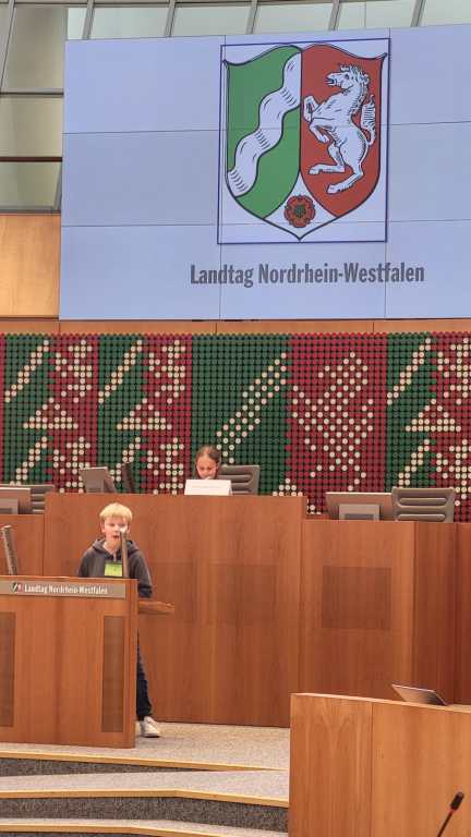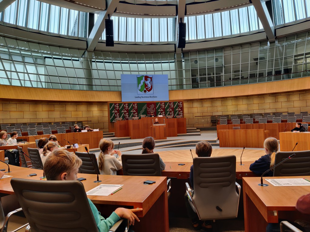Unsere vierten Klassen besuchten den Landtag in Düsseldorf. Sie erlebten dort eine eigene Plenarsitzung und trafen den Vizepräsidenten Rainer Schmelzer.