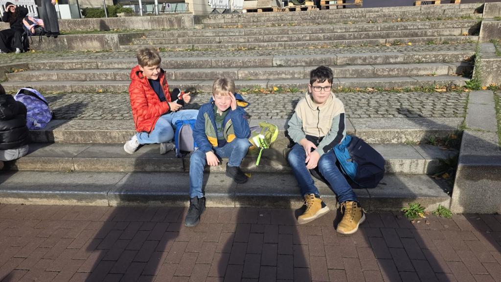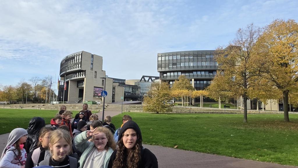 Wir sind um 8.58 Uhr in den Bus gestiegen und auf die Autobahn gefahren. Weil wir wussten, dass wir ungefähr 2 Stunden fahren werden, haben einige Spiele und Bücher mitgenommen, damit uns nicht langweilig wird. Um kurz vor 11.00 Uhr waren wir neben dem Landtag auf der Wiese und konnten noch etwas essen. Danach gingen wir in das Gebäude, wo wir durch eine Sicherheitsschleuse mussten und unsere Sachen kontrolliert wurden. Anschließend gaben wir unsere Jacken und Rucksäcke an der Garderobe ab und gingen direkt zum Mittagessen. Es gab Nudeln mit Tomatensoße. Jede/r von uns wollte eine zweite Portion.