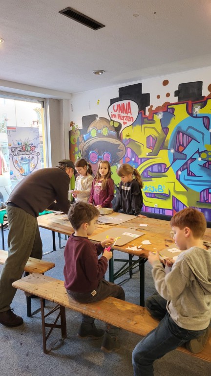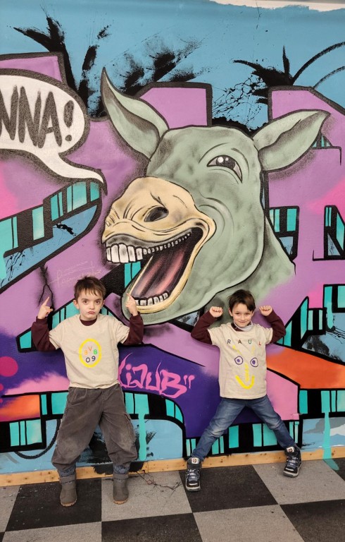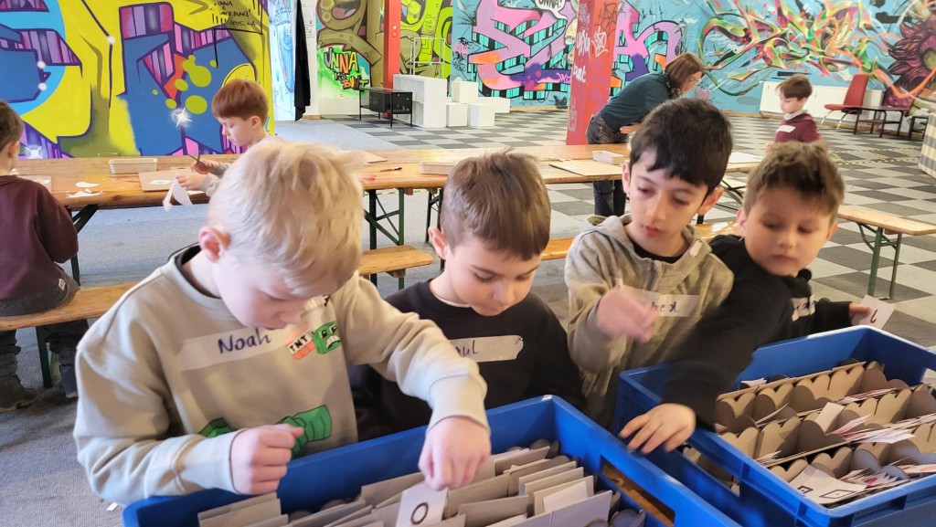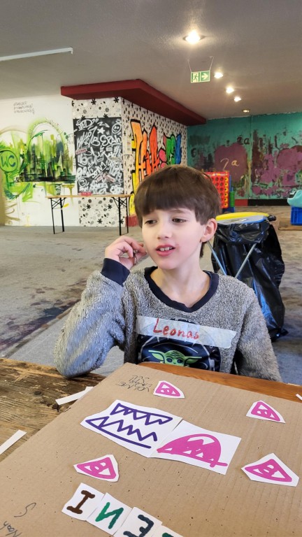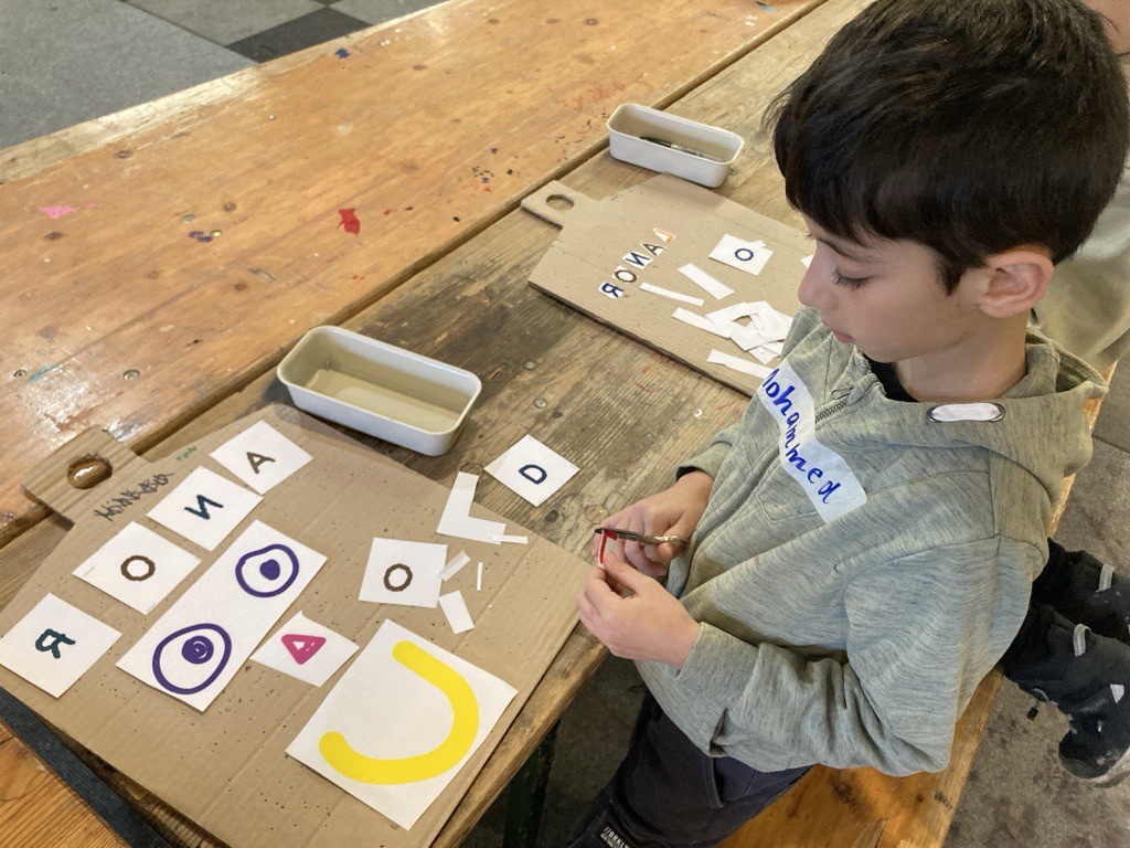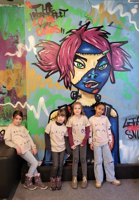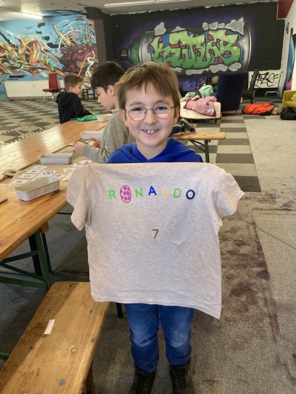 Dort durften die „Seepferdchen“ unter der professionellen Anleitung der Künstler Felix und Max ihre eigenen T-Shirts designen. Es gab eine große Auswahl an bunten Siebdruck-Stickern und Buchstaben, die die Kinder zu kleinen Kunstwerken zusammenstellen konnten. Mit einer großen Heißpresse auf ein T-Shirt gepresst, entstanden 23 wunderschöne individuelle Shirts, die stolz in der Schule gezeigt werden konnten.