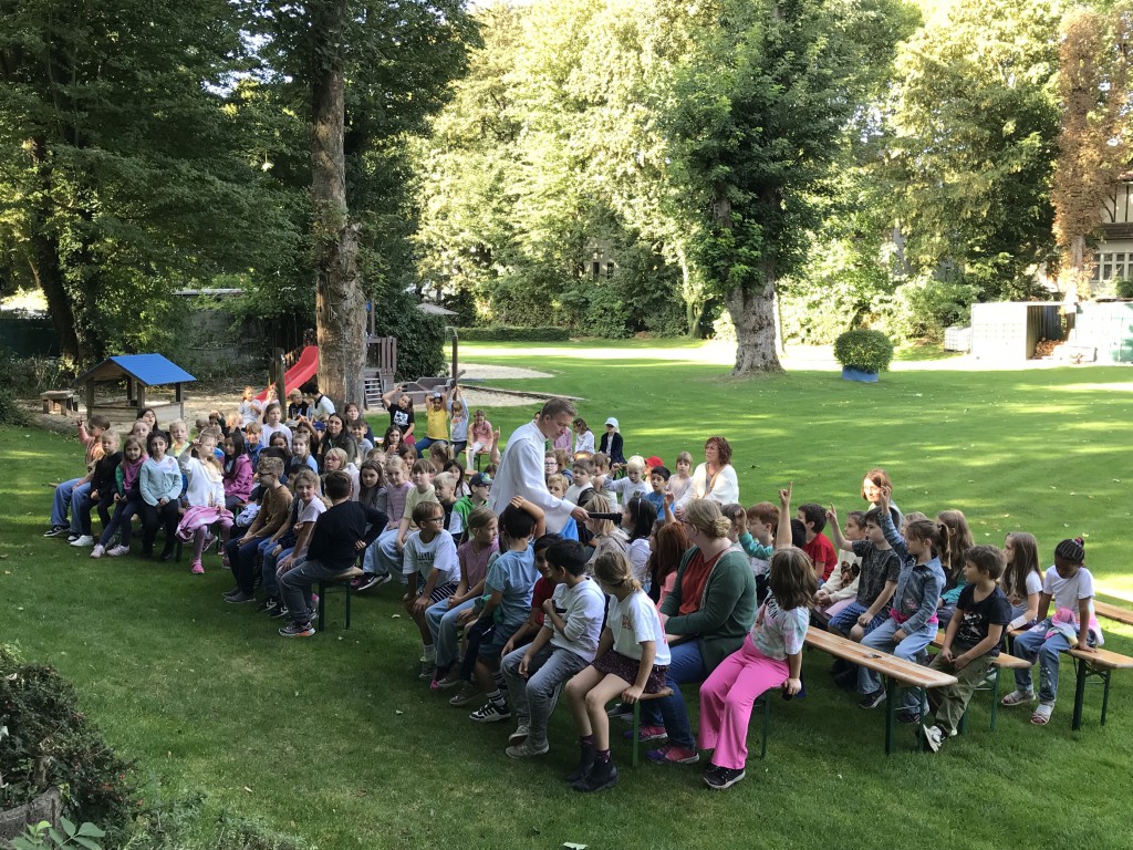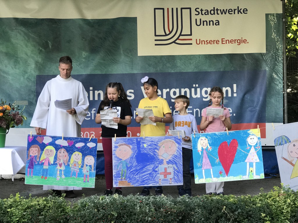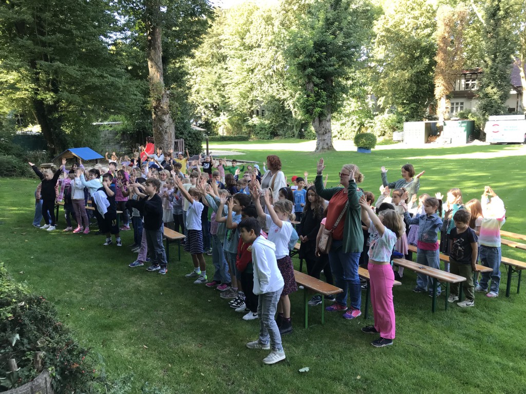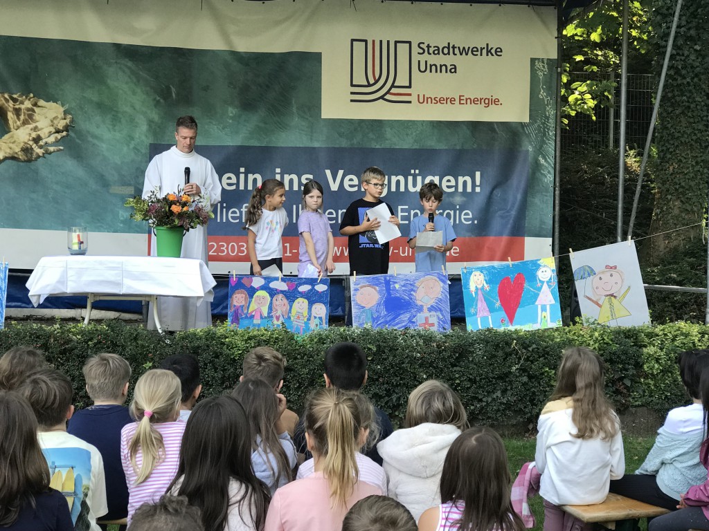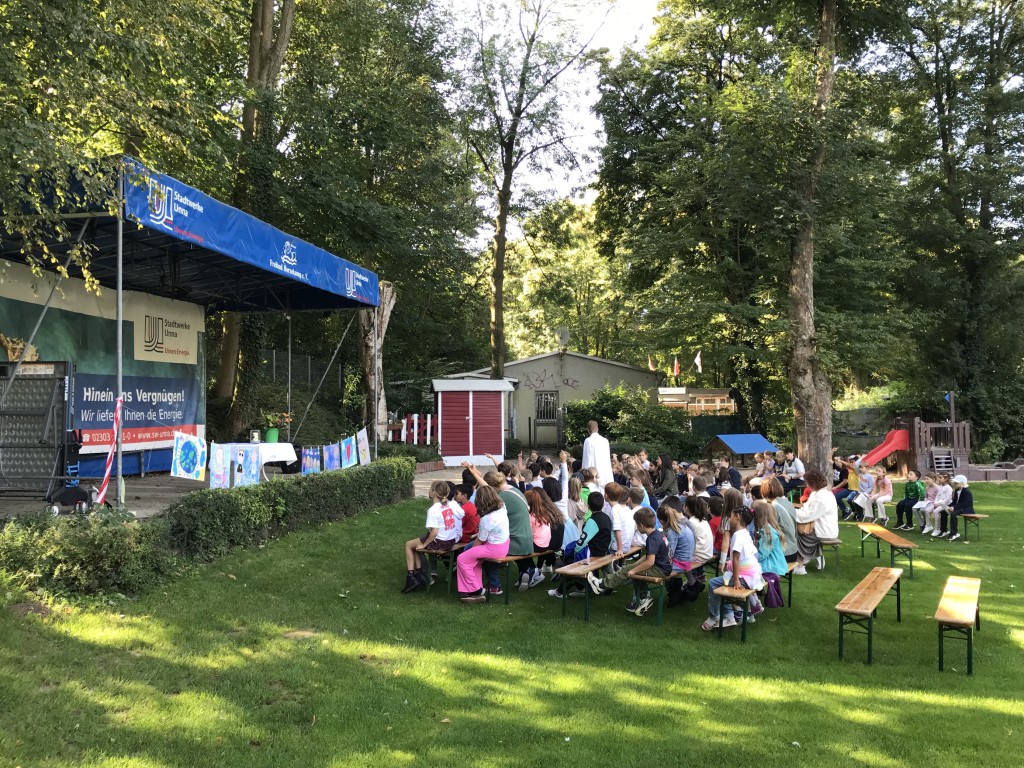 Am Freitag, den 19. September, feierten die Katharinenschulkinder einen Schulgottesdienst zum Tag des Kindes. Unter strahlendem Spätsommerhimmel versammelten sich Schülerinnen und Schüler, Lehrkräfte und Eltern im Freibad Bornekamp, um gemeinsam über ein wichtiges Thema nachzudenken – die Rechte der Kinder.